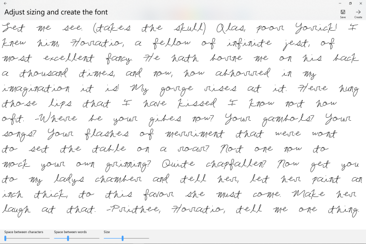 Font Maker показывает пользователю шрифтовую сетку с полупрозрачными буквами, цифрами и спецсимволами. Их нужно обвести, желательно при помощи стилуса. Затем сервис просит написать несколько фраз разной длинны и отрегулировать основные характеристики шрифта: интервалы между символами и словами, размер.