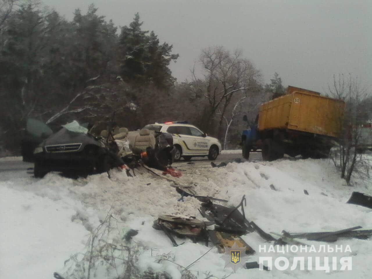 На трасі Київ-Чернігів смт. Залісся легковий автомобіль Опель з п’ятьма пасажирами на борту, не впоравшись з керуванням на слизькій дорозі в’їхав у вантажівку, водій якої зупинився допомогти іншому водієві.