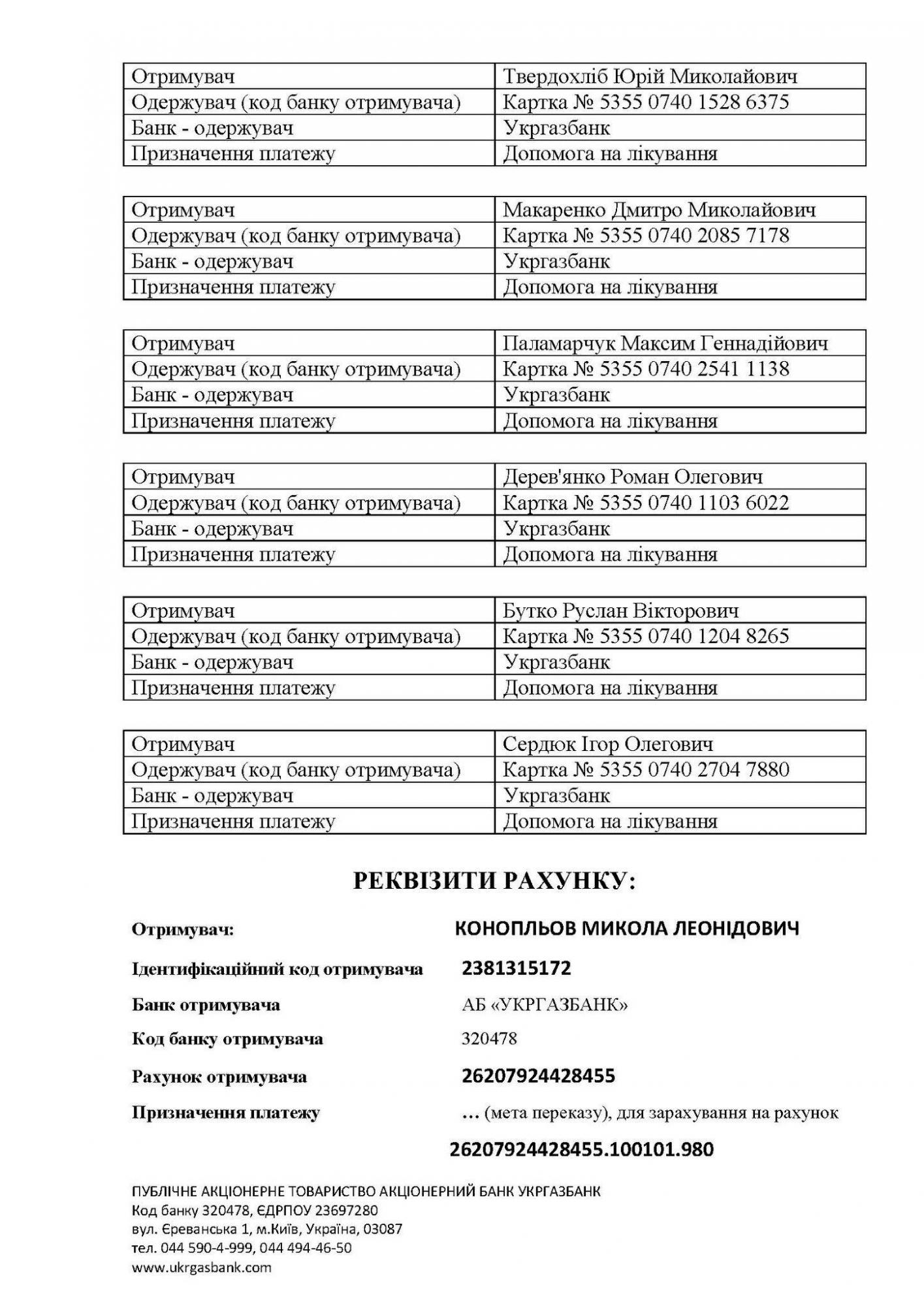 Просимо всіх небайдужих посприяти у наданні посильної матеріальної допомоги за вказаними реквізитами.