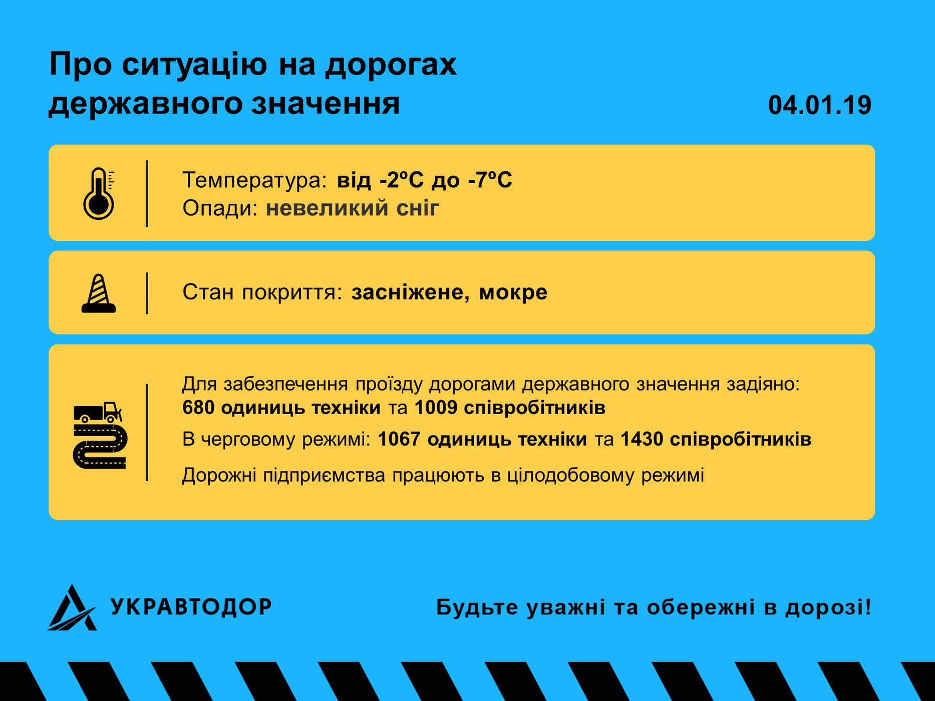 По состоянию на утро 4 января в Украине обеспечен проезд по дорогам государственного значения, сообщает "Укравтодор".