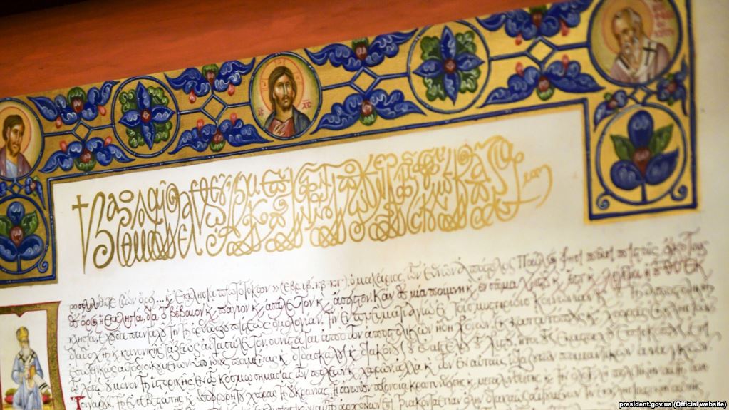 Перед началом богослужения Епифаний и президент Петр Порошенко торжественно внесли в Софийский собор томос об автокефалии. Свиток с томосом развернули и закрепили в соборе. где его смогут увидеть все желающие.