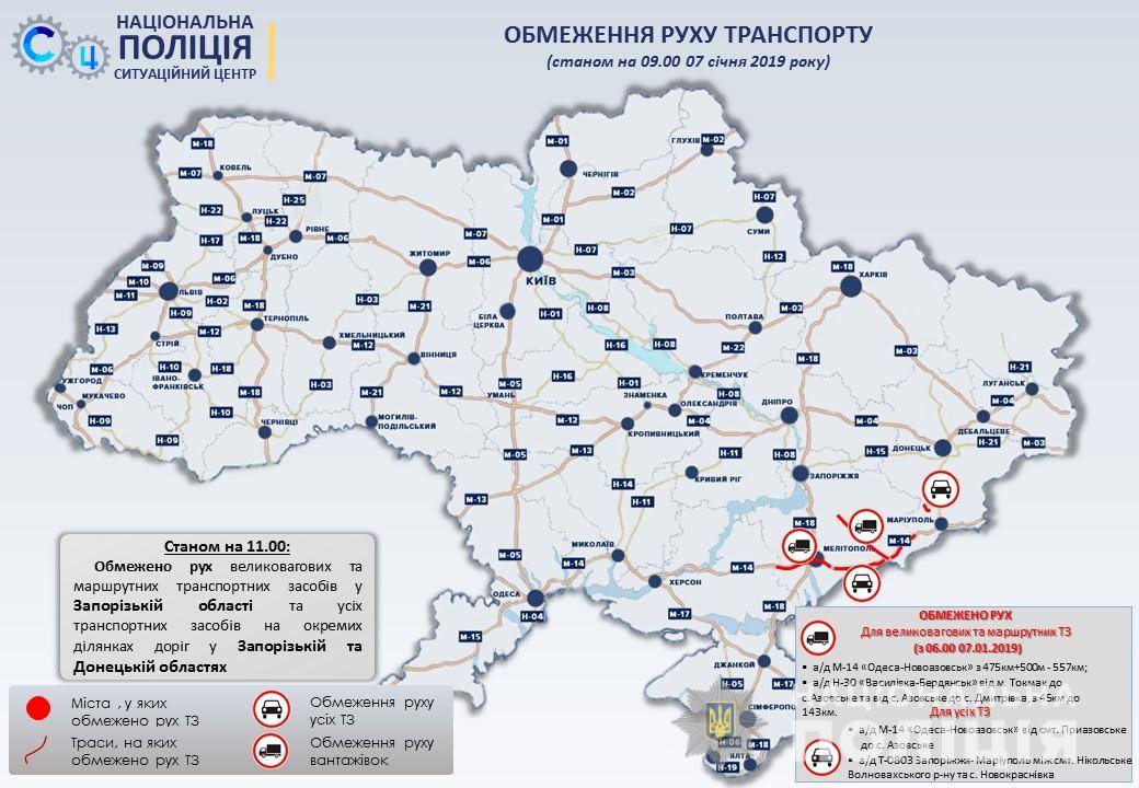 В частности, по состоянию на 11 часов ограничено движение крупногабаритного и маршрутного транспорта на территории Запорожской области. Ограничения коснулись автодорог М-14 "Одесса-Новоазовск" (с 475-го по 557-й километр) и М-30 "Васильевка-Бердянск" – от города Токмак до села Азовское.