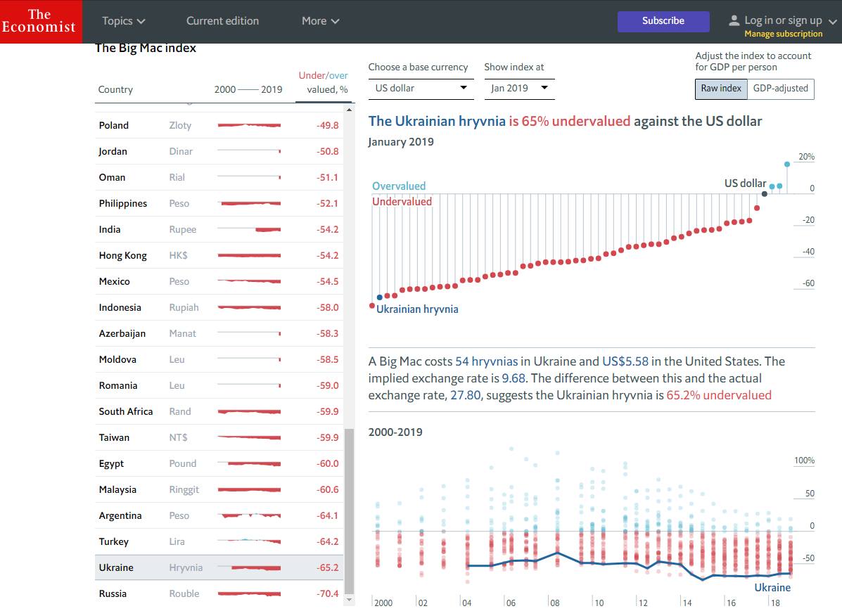 По данным The Economist, стоимость гривны недооценена на 65,2%, а реальный курс по покупательной способности должен быть в размере 9,68 гривен за доллар.