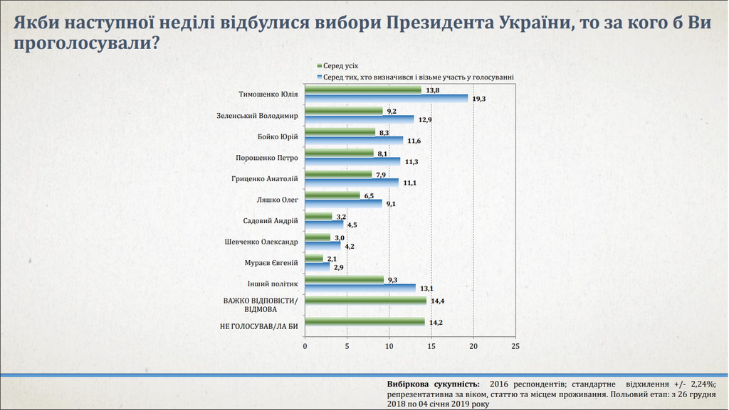 На второй позиции — актер и шоумен Владимир Зеленский. За него готовы отдать свои голоса 12,9% украинцев. За лидера "Оппозиционной платформы "За життя" Юрия Бойко — 11,6%, президента Петра Порошенко — 11,3%, лидера партии "Гражданская позиция" Анатолия Гриценко — 11,1%, лидера Радикальной партии Олега Ляшко — 9,1%, мэра Львова Андрея Садового — 4,5%, народного депутата Александра Шевченко — 4,2% и главу партии "Наши" Евгения Мураева — 2,9%.