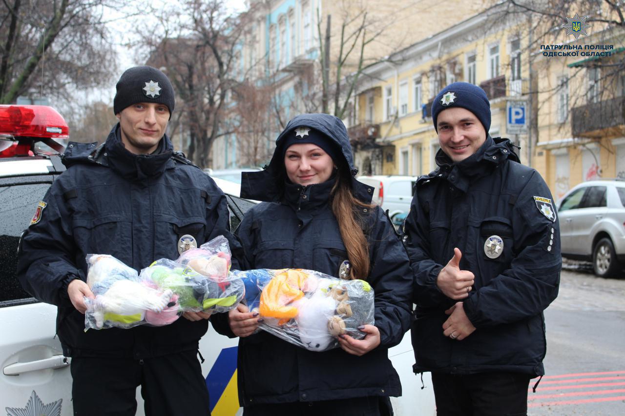 Одесские патрульные провели благотворительную акцию по сбору игрушек, чтобы в случае необходимости развлечь и успокоить детей.