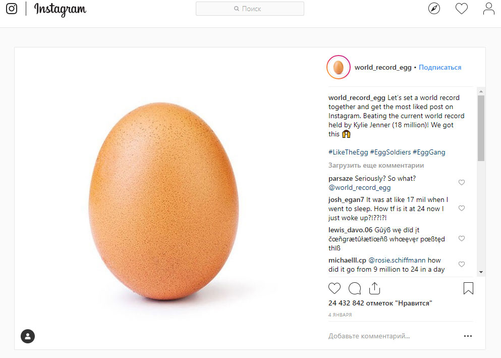 Единственный пост в аккаунте @world_record_egg (яйцо-мировой рекорд) сопровождался хэштегами #LikeTheEgg (лайкайте яйцо) #EggSoldiers (солдаты яйца) #EggGang (банда яйца).