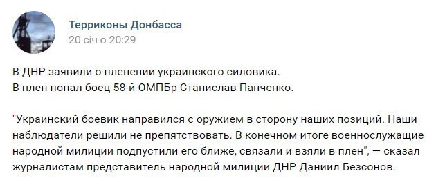Несколько дней о парне ничего не было слышно, пока, 20 января, не появилась первая информация о нем на странице сообщества "Терриконы Донбасса" в одной из соцсетей. В заметке утверждалось, что террористы "ДНР" взяли в плен бойца 58-й ОМПБр Станислава Панченко, который якобы сам подошел к их позициям.