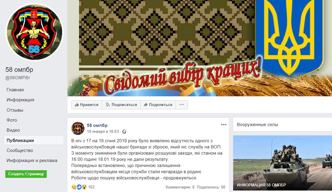 Впервые информация о пропавшем военного появилась 18 января на странице 58-й ОМПБр в Facebook. Имени солдата не распространяли, только написали, что парень покинул службу самовольно, вероятно, из-за "проблемы в семье".