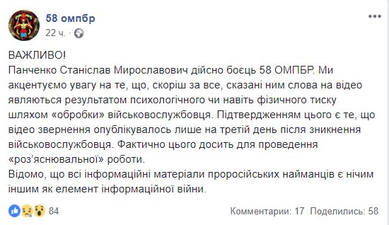 "Подтверждением этого является то, что видео обращение опубликувалось только на третий день после исчезновения военнослужащего. Фактически этого достаточно для проведения "разъяснительной" работы. Известно, что все информационные материалы пророссийских наемников является ничем иным как элемент информационной войны", – написано на странице в ФБ 58-й ОМПБр.