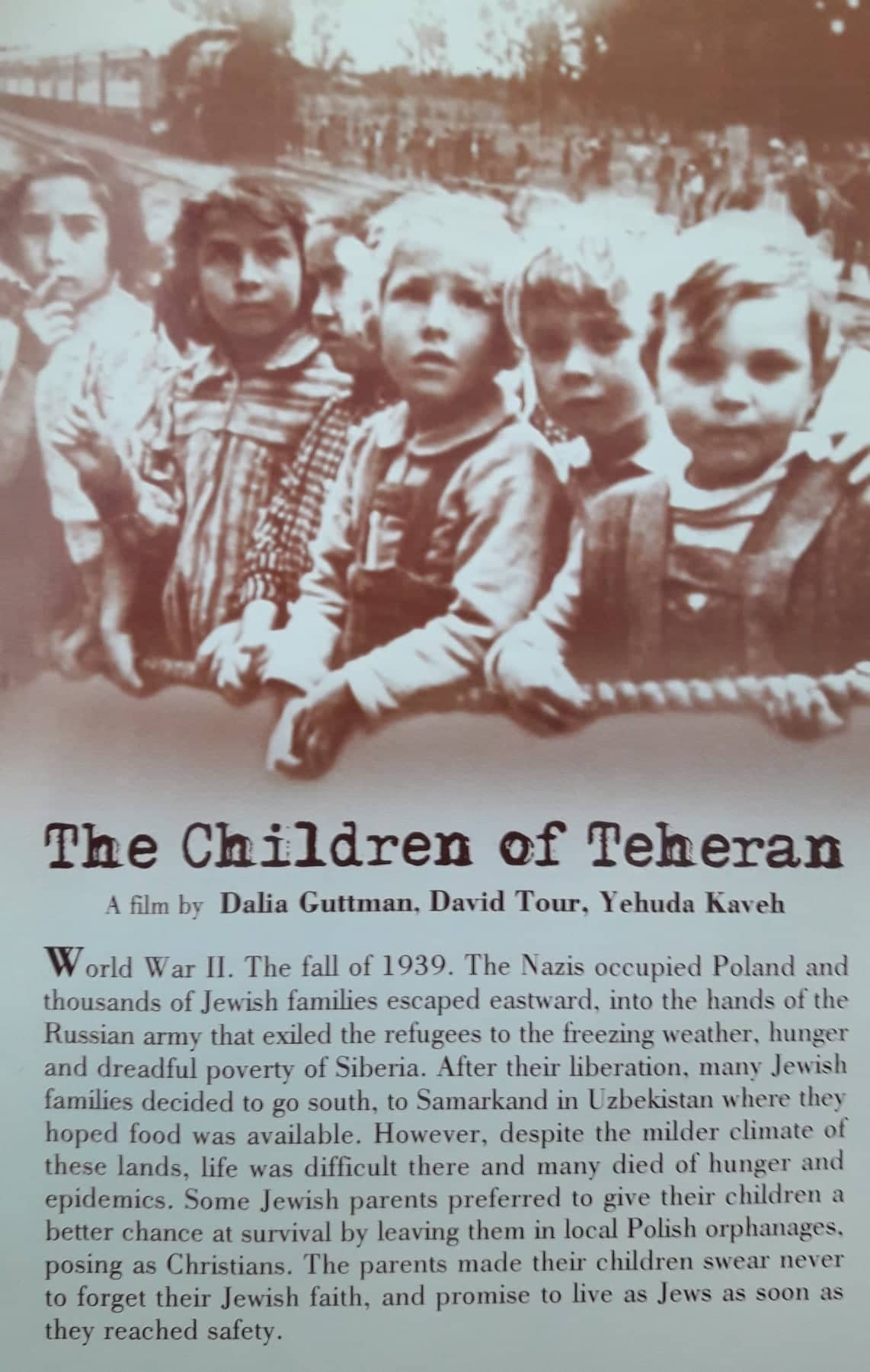 «Дети Тегерана» – это история о находчивости и изобретательности, история о том, каково это – быть беженцем и сиротой, история о спасении 700 детей из оккупированной Польши и их невероятном путешествии в еще не существовавший на тот момент Израиль зимой 1943 года. «Дети Тегерана» – это беспрецедентная операция по спасению детей-сирот, целью которой была их отправка в Палестину. Чтобы в итоге там оказаться, детям пришлось преодолеть сложный путь, пролегавший через далекие страны и города, включая Тегеран. «Дети Тегерана» стали первыми спасенными жертвами Холокоста, свидетелями ужаса, творящегося тогда в Европе, которых увидели представители еврейского населения Палестины.