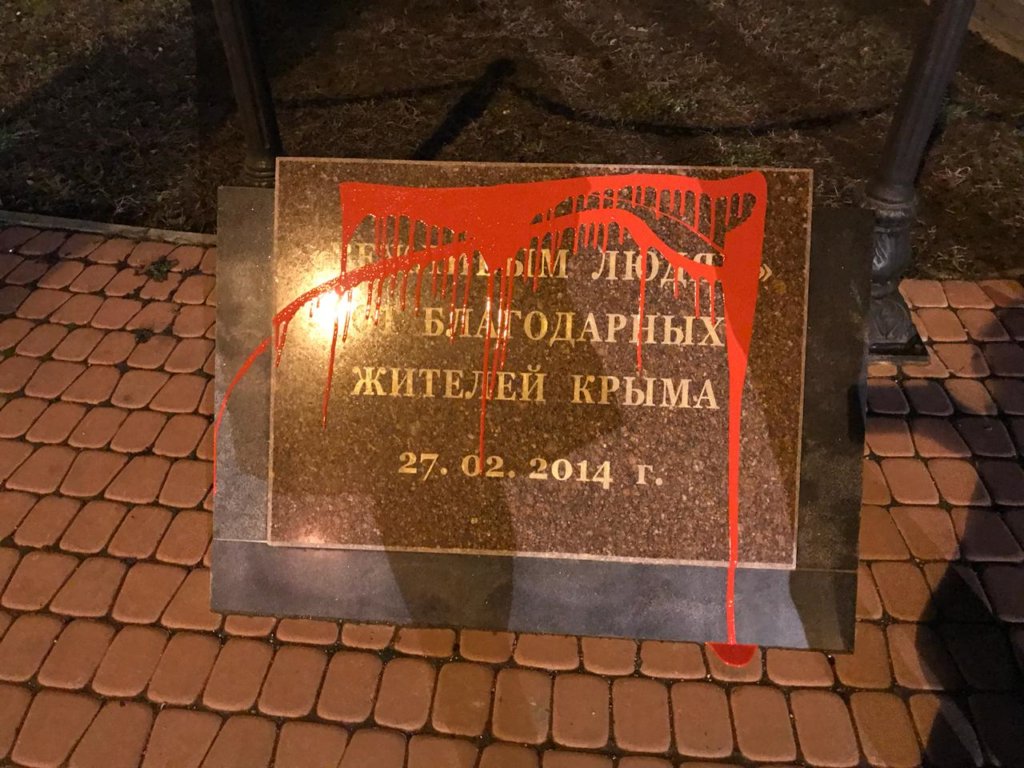 В оккупированном Симферополе облили краской памятник "Вежливым людям" 28 января 2019 06:58 В центре оккупированного Симферополя облили краской памятник "Вежливым людям". Об этом сообщает "Интерфакс". Мужчину, испортившего памятник, задержали. В настоящий момент решается вопрос о возбуждении уголовного дела по статье "вандализм".