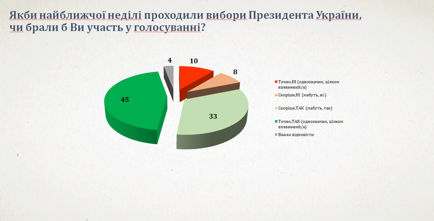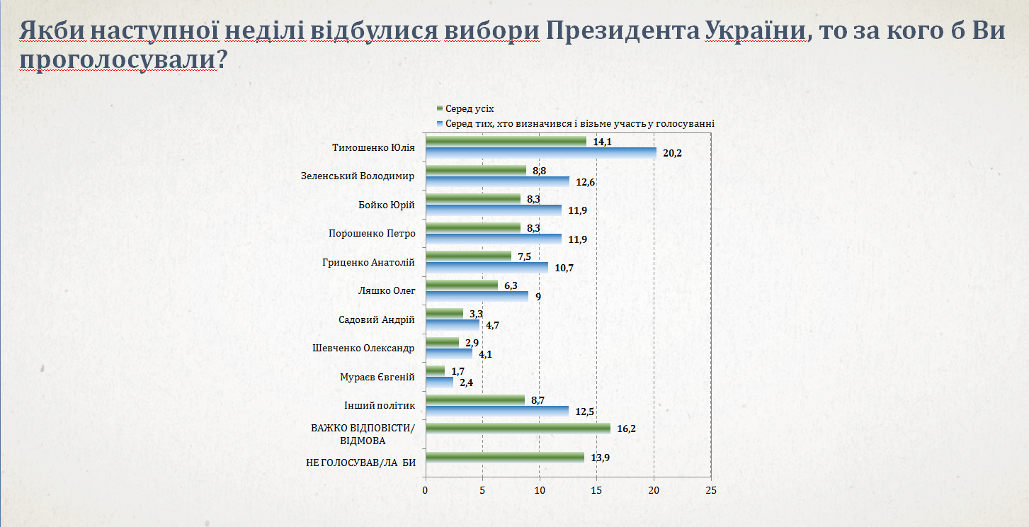 Согласно результатам исследования, если бы выборы президента Украины состоялись в следующее воскресенье, за лидера "Батькивщины" проголосовали бы 20,2% (среди тех, кто определился и примет участие в выборах).
