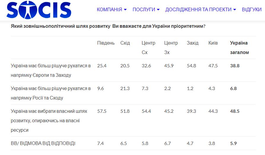 В вопросе внешнеполитического развития украинцы в большинстве являются приверженцами собственного пути с использованием своих ресурсов, а также движения в направлении Европы и Запада.