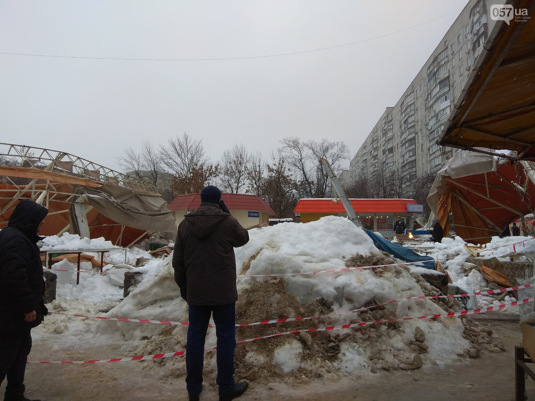 Сейчас рынок работает в штатном режиме, рабочие ликвидируют последствия обрушения. Место аварии огородили лентой, отмечает 057.
