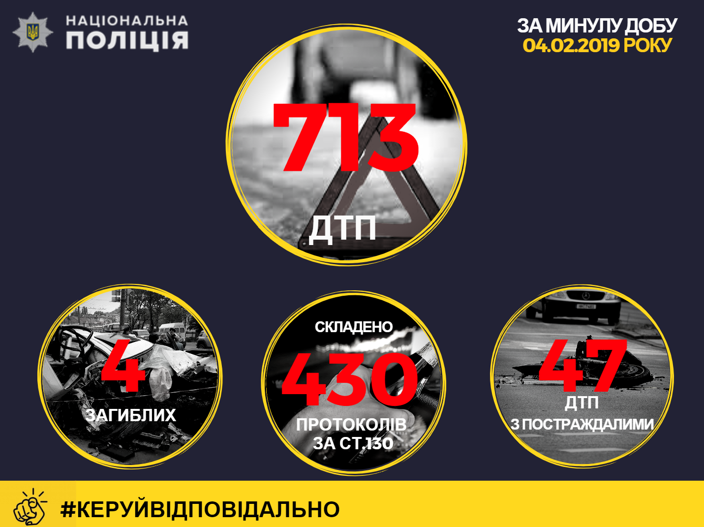 За минулу добу сталось 713 ДТП з 47 постраждалими. У дорожньо-транспортних пригодах загинуло 4 людини.