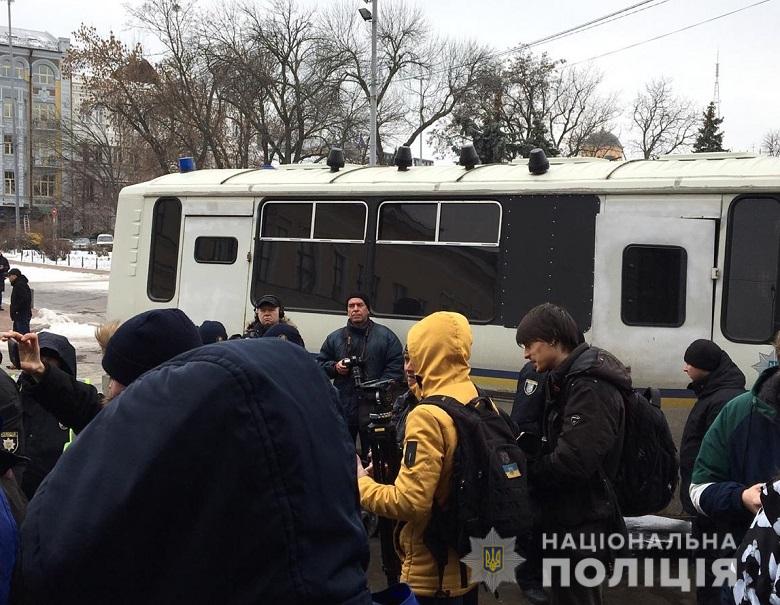 Подія трапилася на Контрактовій площі: сюди підійшла організована група молодиків із прикритими обличчями. Аби попередити будь-які провокації, після спілкування із представниками поліції діалогу було прийнято рішення про їх доставку до управління поліції. У службовому транспорті молодики повикидали зеленку, а вже в управлінні у них вилучили ножі, газові балончики та пістолет. Зараз вони надають пояснення. Їх діям буде надана правова оцінка.