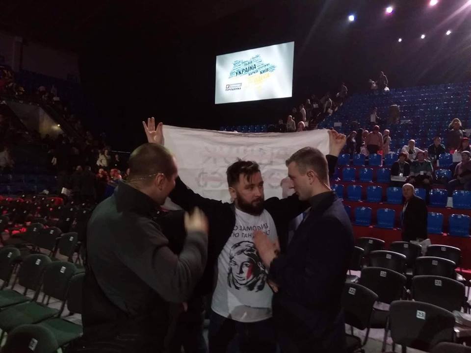 Охранники на форуме президента Петра Порошенко забрали телефон у активиста, который хотел поднять плакат "Кто заказал Катю Гандзюк?" и порвали плакат.