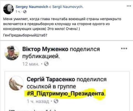 «Меня умиляет, когда глава генштаба воюющей страны неприкрыто включается в предвыборную клоунаду на стороне одного из конкурирующих цирков) Это мило! Очень!», — пишет блогер Сергей Наумович.