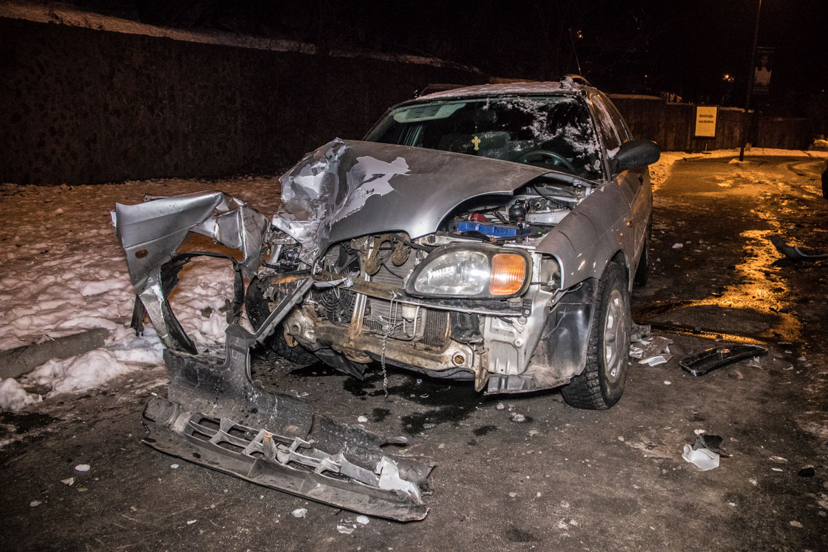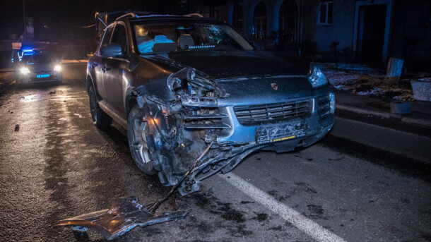 Сегодня ночью в районе Кловского спуска в Киеве произошло ДТП, в котором Porsche Cayenne влетел в припаркованный на тротуаре Suzuki Baleno.