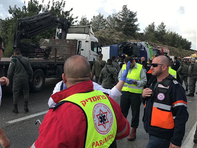 На месте происшествия работали спасатели, пожарные и полиция. Прибыли бригады скорой помощи "Маген Давид Адом". 443-я трасса сразу была перекрыта в обоих направлениях.