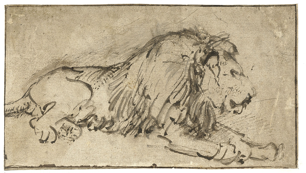 Второй раздел выставки посвящен людям в жизни и творчестве Рембрандта, теме на самом деле необъятной. Это и камерные, выполненные с любовью и нежностью портреты матери, жены Саскии и сына Титуса, и большая серия городских сценок и типов — уличных торговцев, нищих, бродячих музыкантов и актеров, среди которых такие шедевры, как схваченный несколькими экспрессивными росчерками пера «Портрет актера Виллема Бартольса Рюйтера» (1638) и неожиданный в этом ряду «Лежащий лев» (1660), где художник использует тростниковое перо, а для получения большей мягкости штриха — влажную кисть и растирку пальцем. В рисунках, часто на тонированной бумаге, он нередко сочетает несколько техник, чтобы добиться разнообразных эффектов и настроений.
