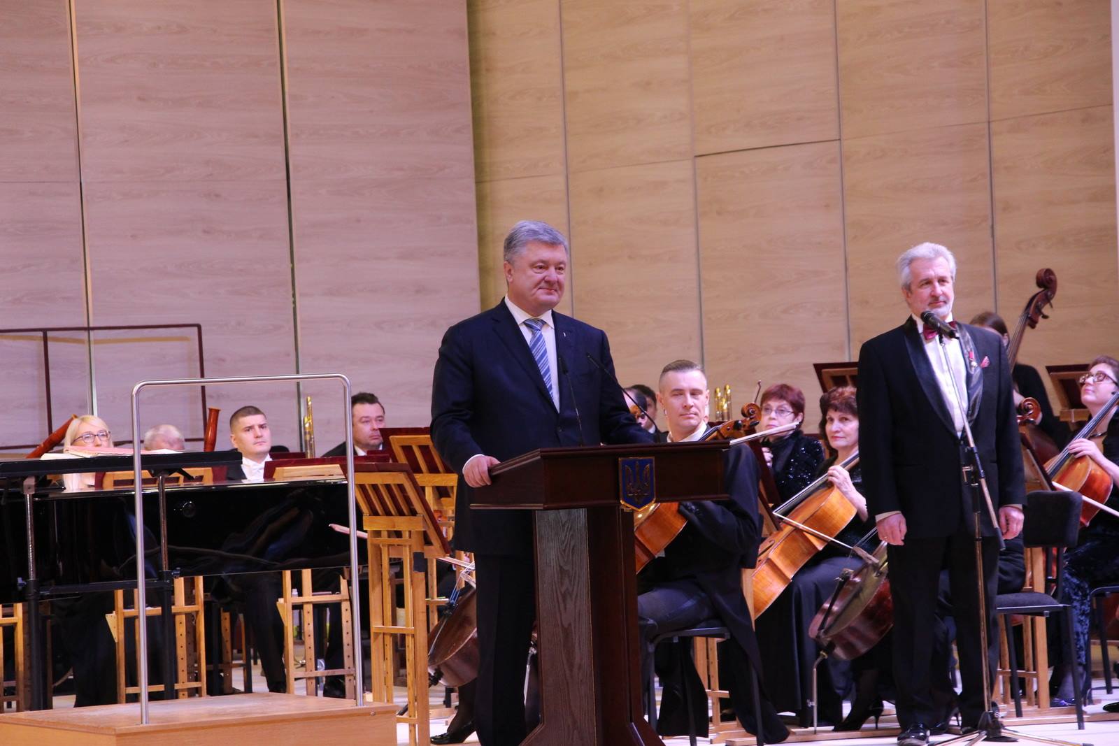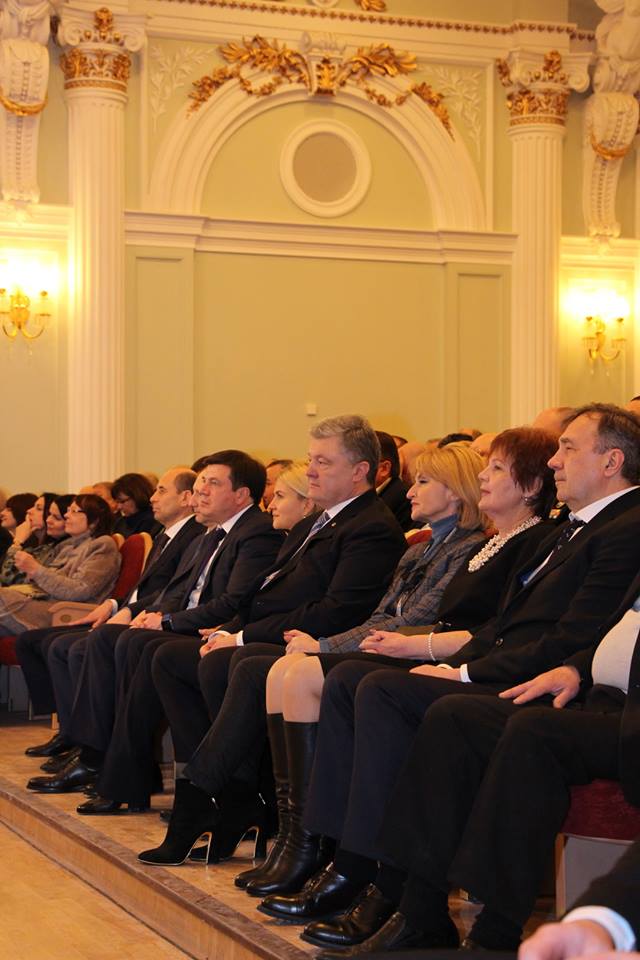 Президент Украины Петр Порошенко посетил сегодня первый концерт в восстановленном большом зале Харьковской областной филармонии.