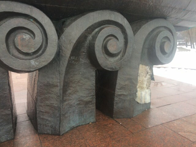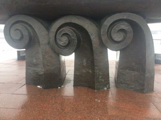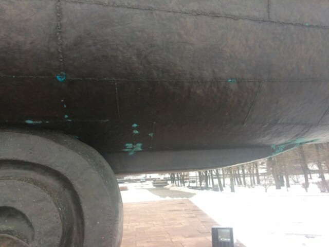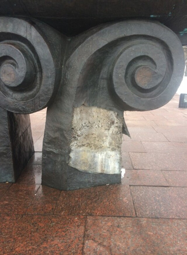 Неизвестные злоумышленники ограбили основание памятника, которое сделано в виде трех больших волн. С одной из них вандалы ободрали около квадратного метра медной обшивки и теперь в этом месте зияет бетон.
