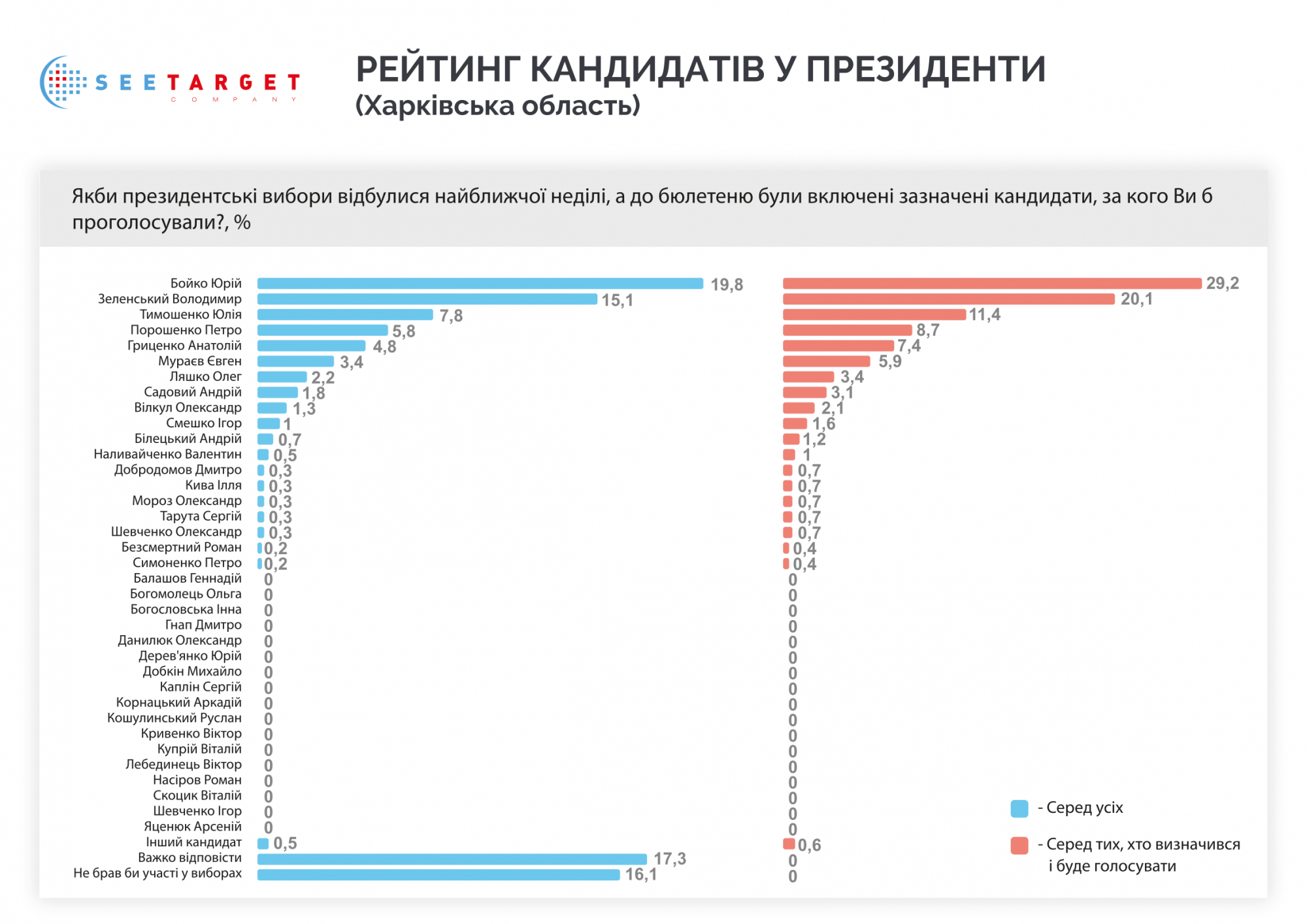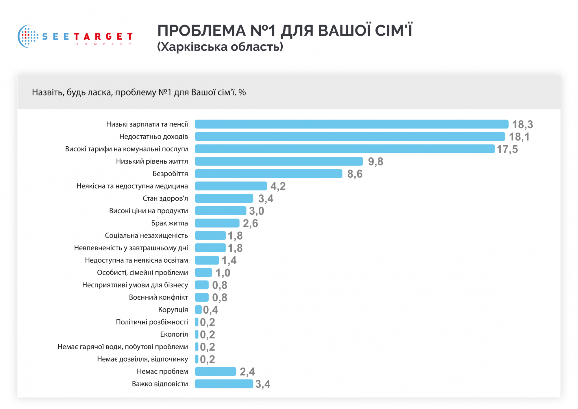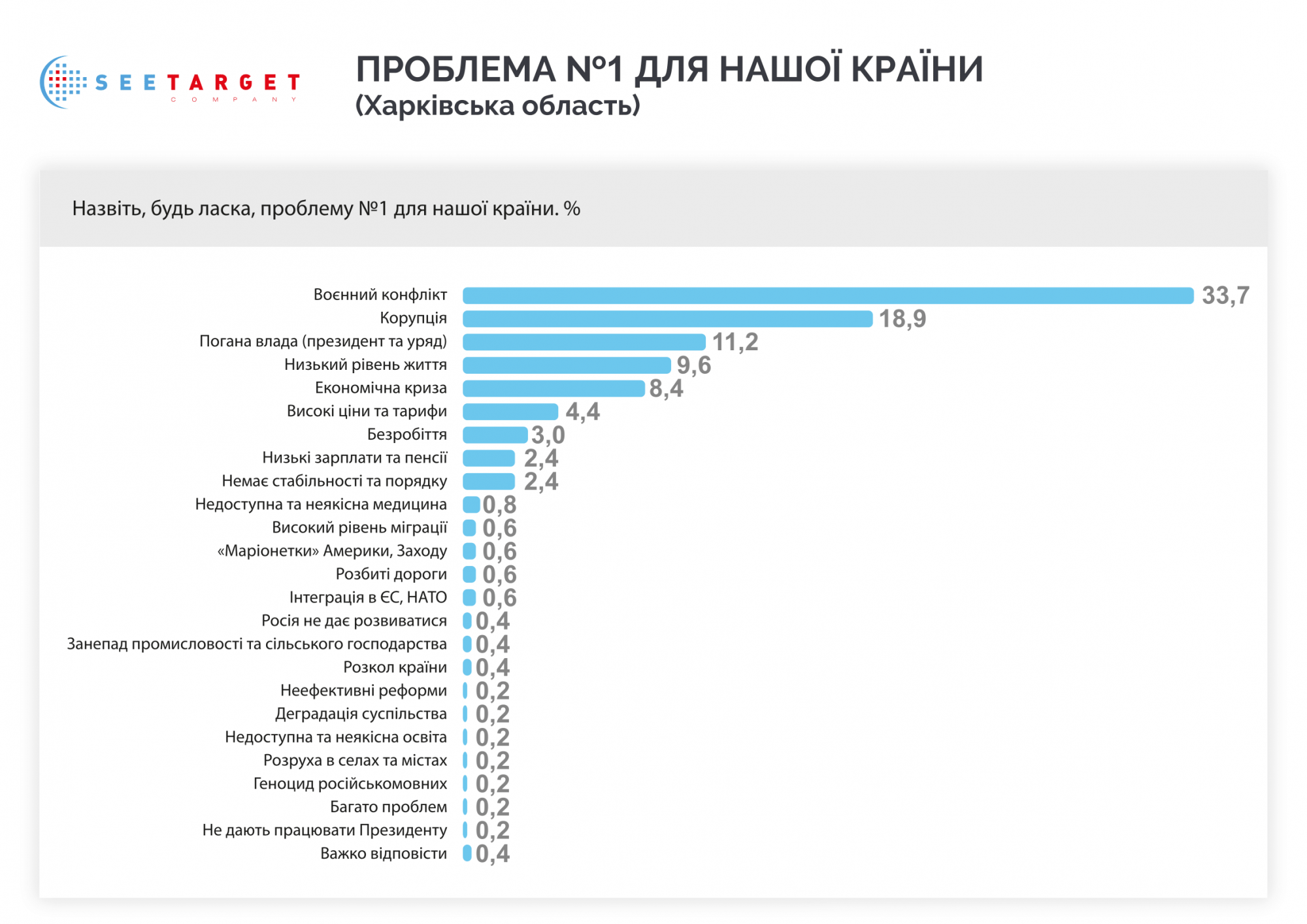 Также опрос показал, что проблемой №1 для страны жители Харьковской области считают: непрекращающийся военный конфликт на востоке Украины (33,7% опрошенных), коррупцию (18,9%) и плохую власть (11,2%).
