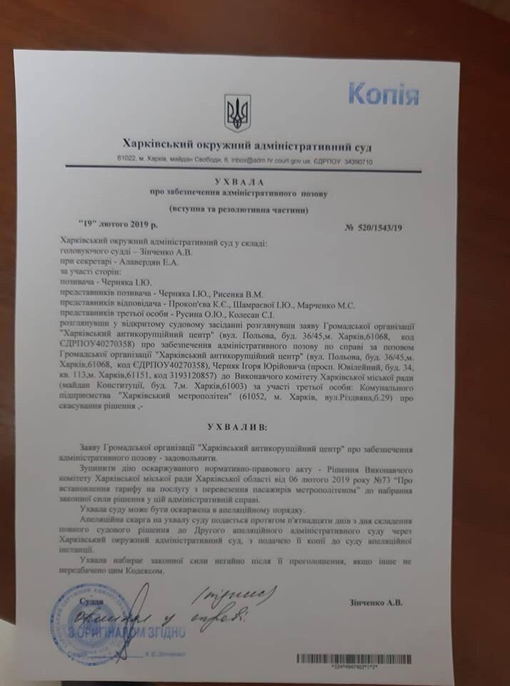 Того ж дня, суддями Шляховою Оленою Миколаївною та Зінченком Андрієм Вікторовичем постановлені ухвали про забезпечення адміністративних позовів шляхом зупинення дії Рішення Виконавчого комітету Харківської міської ради Харківської області від 06.02.2019р. №72 “Про встановлення тарифів на послуги з перевезення пасажирів і багажу міським електричним транспортом (трамваєм та тролейбусом)” та дії Рішення Виконавчого комітету Харківської міської ради Харківської області від 06.02.2019р. №73 “Про встановлення тарифу на послугу з перевезення пасажирів метрополітеном”, а також проголошені вступна та резолютивна частини зазначених ухвал відповідно до статті 243 Кодексу адміністративного судочинства України.