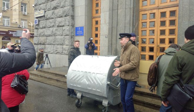 В Харькове активисты, протестующие против новых тарифов на проезд в электротранспорте, привезли ко входу в мэрию мусорный бак, сообщает NewsRoom.