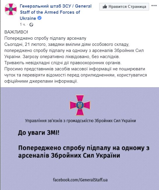 В Генштабе рассказали, как где-то кто-то пытался поджечь какой-то арсенал 21 февраля 2019 17:50 Об этом говорится в сообщении ГШ ВСУ: