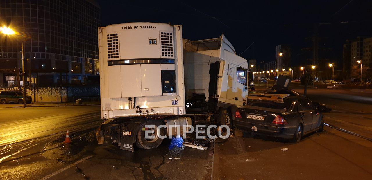 В это время со стороны улицы Андрея Малышко на большой скорости Mercedes врезался в кабину грузовика. Удар был такой силы, что кабину грузовика развернуло почти на 180 градусов.