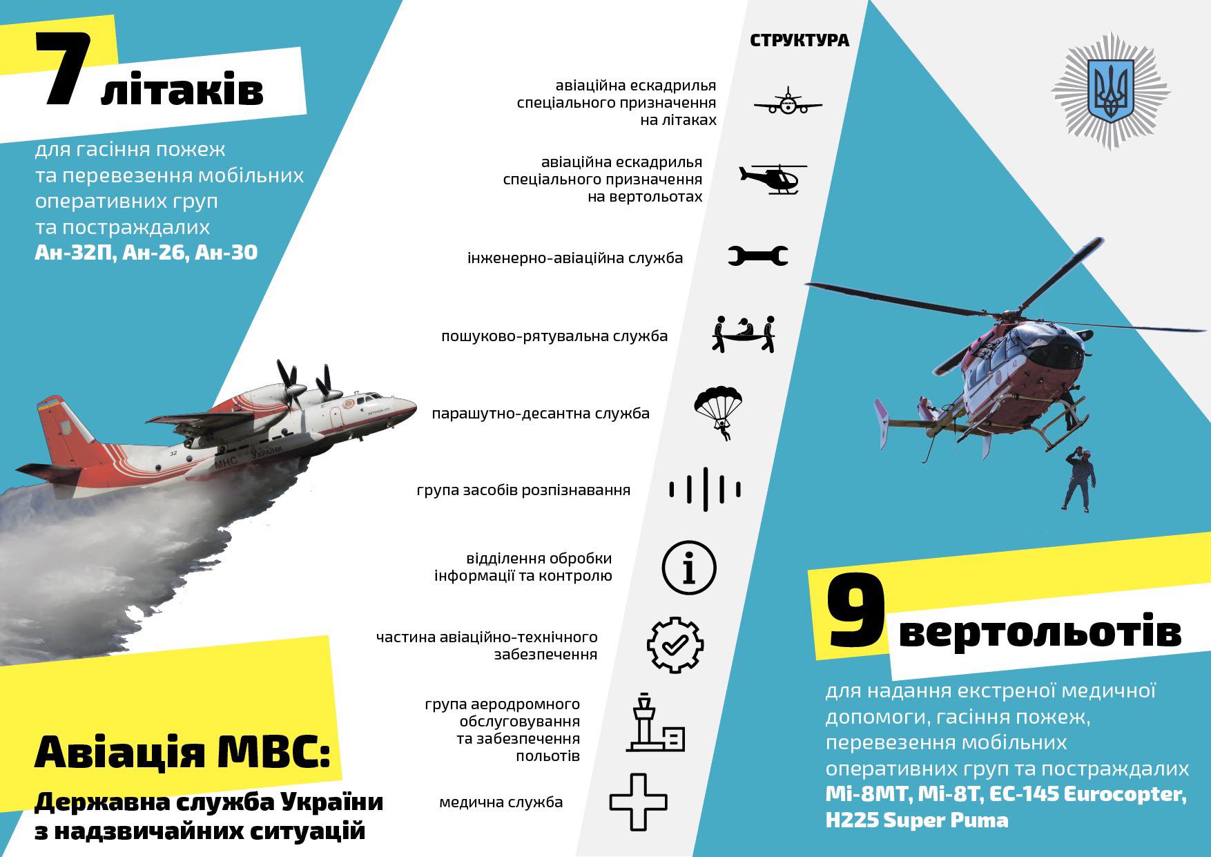 Глава ГСЧС Николай Чечеткин рассказал, что сейчас Государственная служба Украины по чрезвычайным ситуациям насчитывает 7 самолетов - Ан-32П, Ан-26 и Ан-3 и 9 вертолетов - Ми-8МТ, Ми-8Т, ЕС-145 Eurocopter, H225 Super Puma для поисково-спасательных операций, тушения пожаров, разведки зон чрезвычайной ситуации, доставки гуманитарных грузов, а также выполнение задач по санитарной авиации.