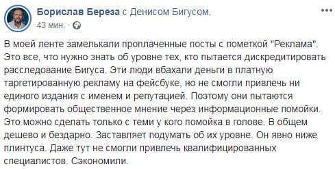 "В моей ленте замелькали проплаченные посты с пометкой "Реклама". Это все, что нужно знать об уровне тех, кто пытается дискредитировать расследование Бигуса. Эти люди вбахали деньги в платную таргетированную рекламу в "Фейсбуке", но не смогли привлечь ни единого издания с именем и репутацией. Поэтому они пытаются формировать общественное мнение через информационные помойки", - написал нардеп.