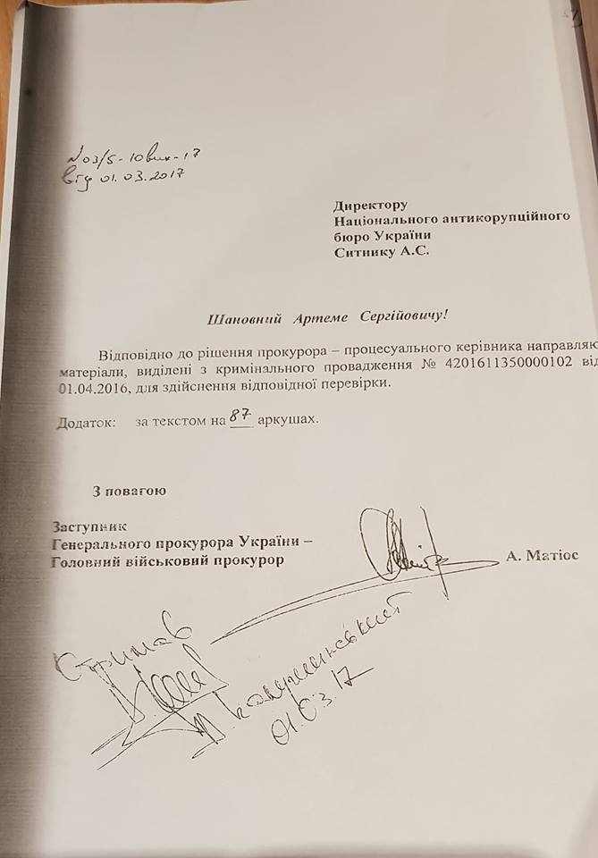 А это титульный лист того самого дела с той самой перепиской, который получило НАБУ. На нем подпись главы детективов НАБУ Андрея Калужинского.