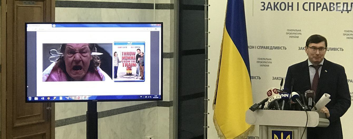 В презентации генерального прокурора Украины Юрия Луценко во время брифинга был показан кадр из старой американской комедии "Сбрось маму с поезда". И не случайно – таким образом Луценко отомстил Юлии Тимошенко, которая также вспомнила голливудский фильм в контексте действующего президента и генпрокурора.