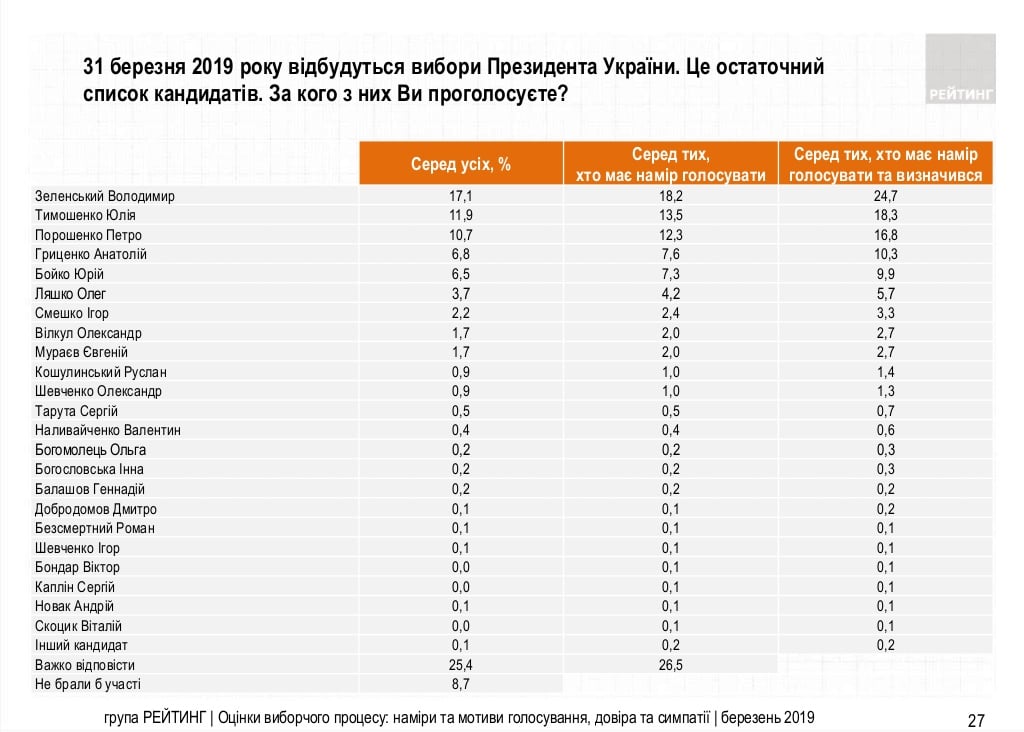 Если бы президентские выборы в Украине происходили в начале марта, наибольшие шансы выйти во второй тур имели бы Владимир Зеленский, Юлия Тимошенко и Петр Порошенко Об этом свидетельствуют данные опроса Социологической группы "Рейтинг".