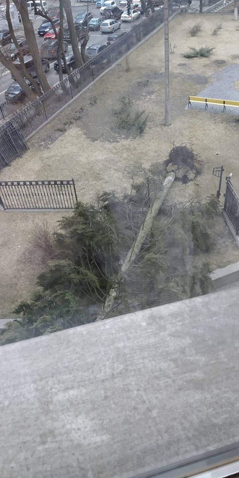 Фото с поваленным деревом в Сеть выложила советник вице-спикера Ольга Криворучко. По ее словам, ель не выдержала порывистого ветра.