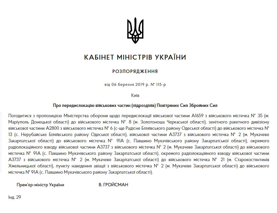 Відповідне Розпорядження «Про передислокацію військових частин (підрозділів) Повітряних Сил Збройних Сил України» було прийнято нещодавно під час засідання Кабінету Міністрів України.