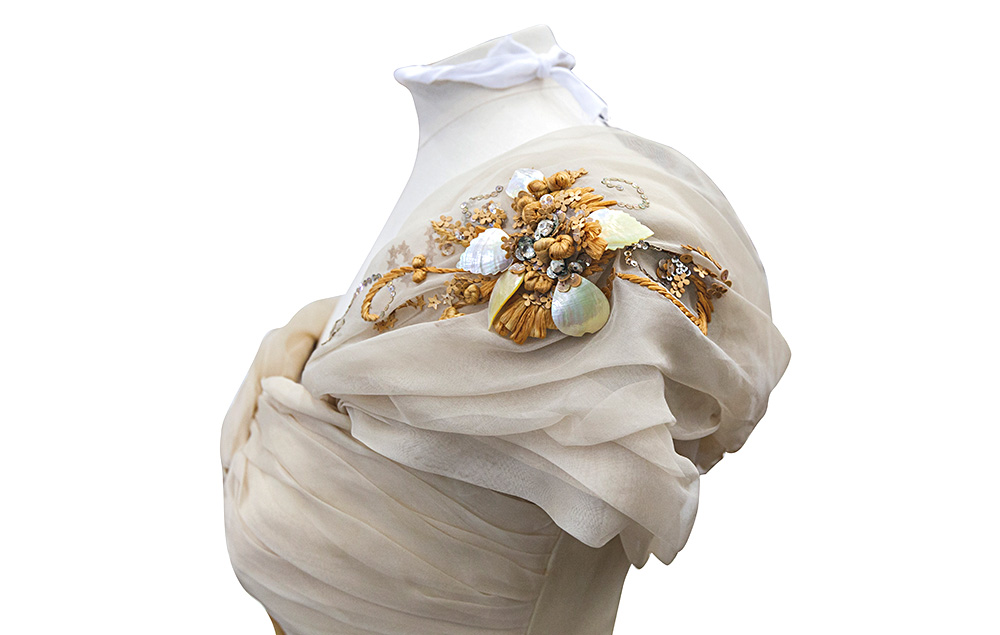 Принцесса Маргарет в шутку говорила, что ее платье покрыто картофельными очистками. На самом деле оно расшито перламутровыми лепестками, стразами, блестками из ламинированного спрессованного желатина и соломы, имитирующей вышивку рафией. «В 1951 году это был очень современный выбор очень современной принцессы, — говорит одна из кураторов выставки Ориол Каллен. — Синтетические материалы дали цвета и эффекты, добиться которых иначе было бы невозможно. Это был очень смелый выбор вечернего платья для такого важного мероприятия».