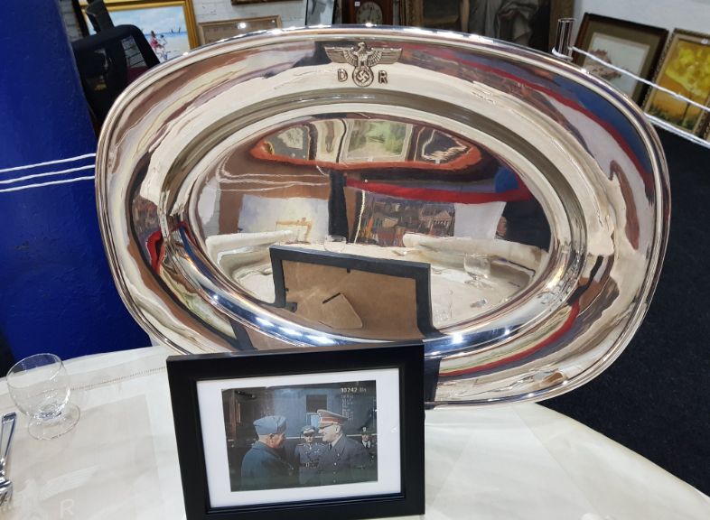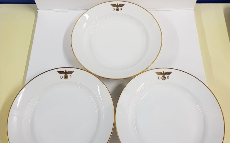 Тарелки с гербом Третьего рейха, изготовленные к 50-летию Адольфа Гитлера, серебряные столовые приборы, большое блюдо, салфетки и скатерть со свастикой, которые должны были использоваться в личном поезде немецкого диктатора, были выставлены на аукцион в столице Северной Ирландии Белфасте.