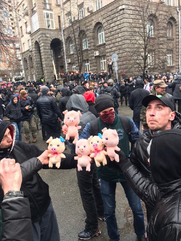 Они также принесли к зданию АП сотни мягких игрушек (свиней), которыми закидали территорию АП.