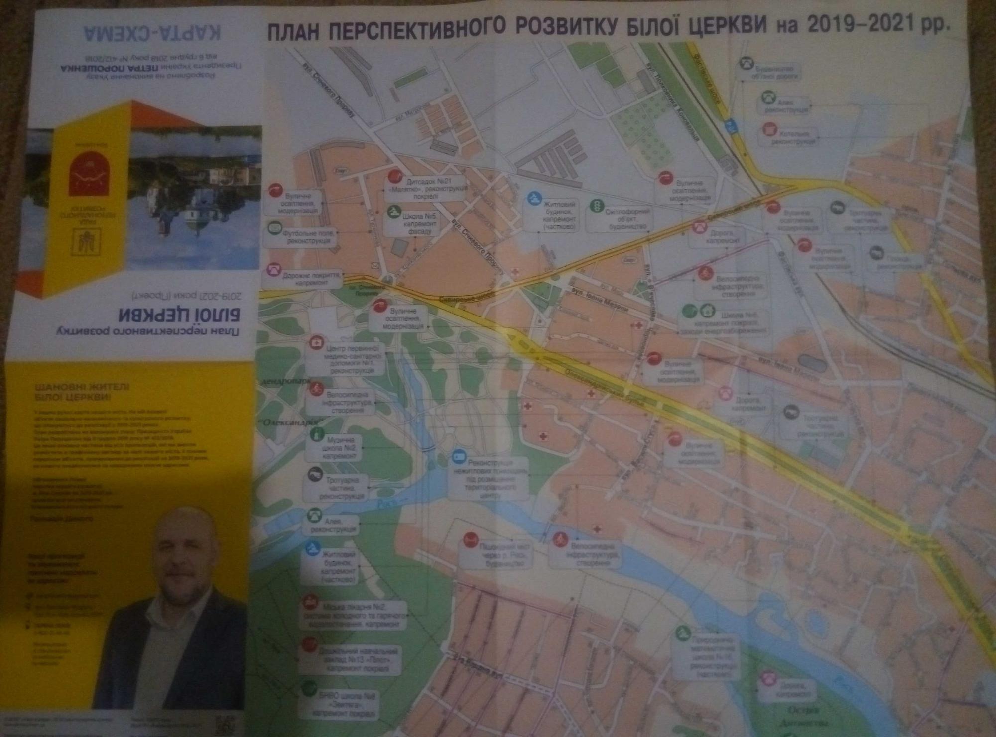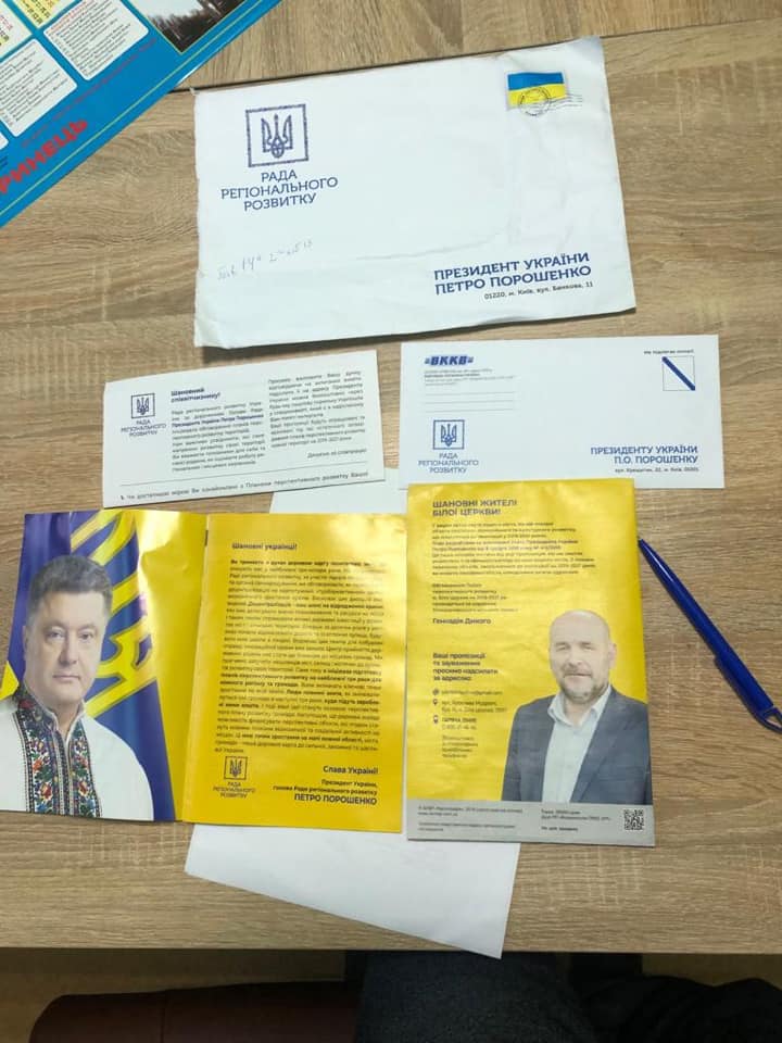 В Белой Церкви по жилым домам разносят карты города с "перспективным планом развития". На карте обозначены объекты, которые будут финансироваться в 2019-2021 годах. На полиграфической продукции изображенное фото городского головы, Геннадия Дикого и кандидата в президенты Петра Порошенко. На конвертах, в которых распространяются эти материалы есть подписи "Совет Регионального Развития" и "Президент Украины Петра Порошенко".
