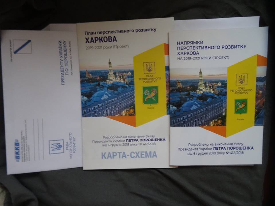 Зміст конверту: брошура "Напрямки перспективного розвитку Харкова на 2019 -2021 роки (проект). Розроблено на виконання Указу Президента України Петра Порошенка від 6 грудня 2018 року № 412/2018", карта-схема "План перспективного розвитку ХАРКОВА 2019-2021 (проект)", анкета (надрукована тиражем 730 000 примірників "без будь-яких бюджетних витрат" - хто ж цей щедрий спонсор?), в якій на умовах анонімності (при цьому на зворотньому боці пропонується вказати усі персональні дані!!!!) просять оцінити якість роботи регіональних і місцевих керівників (як раз вчасно - за два тижні до виборів) і передоплачений конвертик.