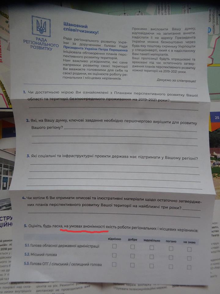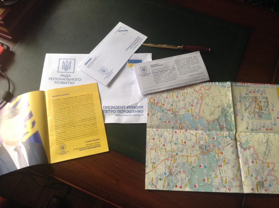 Дають мені (хотіли під розпис, але я відмовилася розписуватися) конверт формату А4 від "Ради регіонального розвитку" адресований чомусь не мені, а "Президенту України Петру Порошенку". На моє питання, хто це фінансує, жіночки завчено відповіли, що вони волонтери, розносять листи безкоштовно. Ага, повірила :) Мабуть бюджетники якісь в робочий час окучують округ.