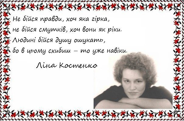 Лина Костенко создала новейшие стили в украинской литературе, но была безжалостна и максимально критична по отношению к власти и тогдашнего режима. В 60-х писала письма-протесты против арестов украинской интеллигенции. После этого был наложен запрет на печать ее произведений.