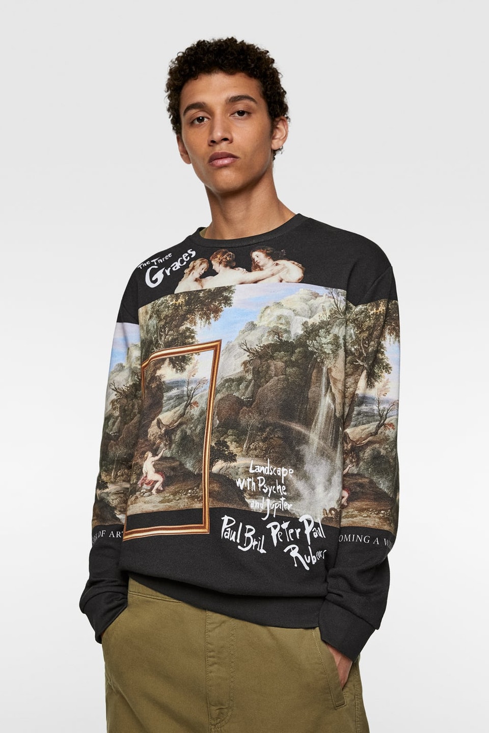На свитшоте — коллаж двух картин Рубенса: «Три грации» (1630—1635) и «Пейзаж с Психеей и Юпитером» (около 1610 года).