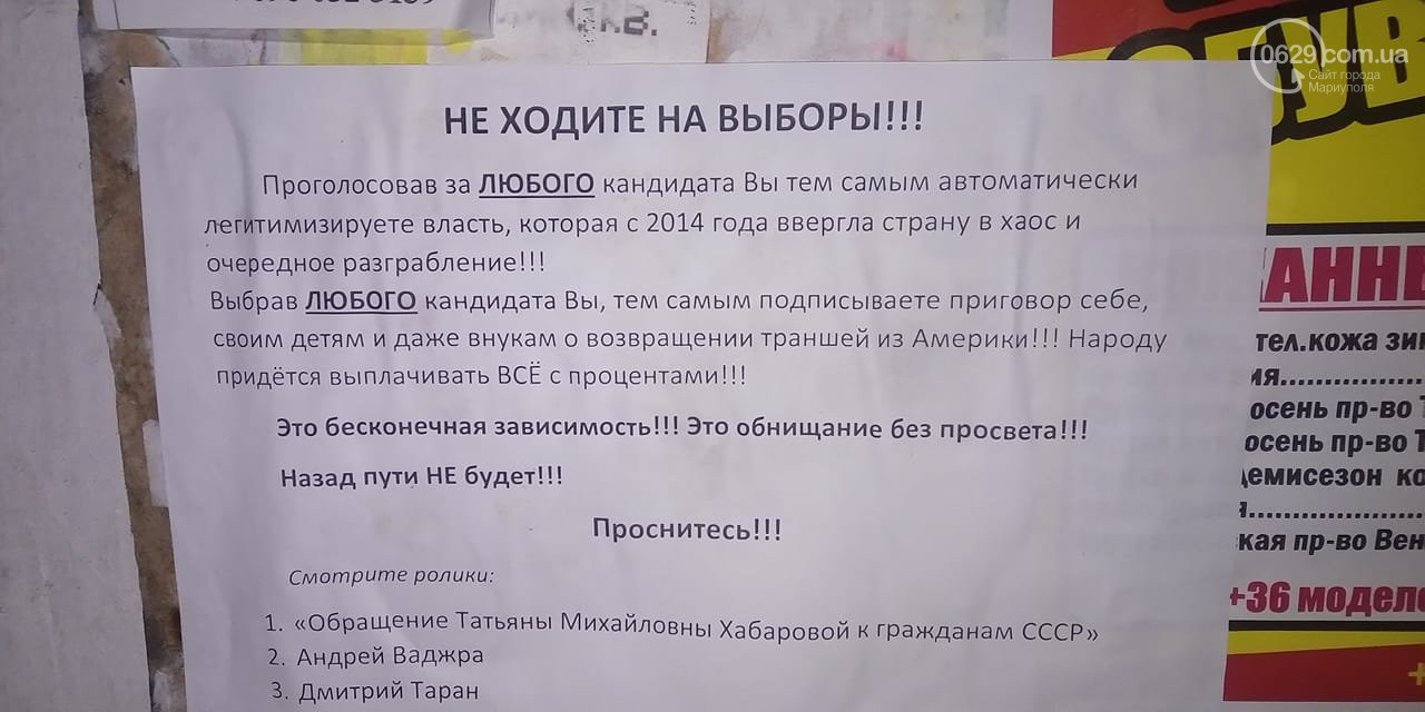 Накануне президентских выборов на улицах Мариуполя появились листовки и надписи, призывающие не участвовать в голосовании.