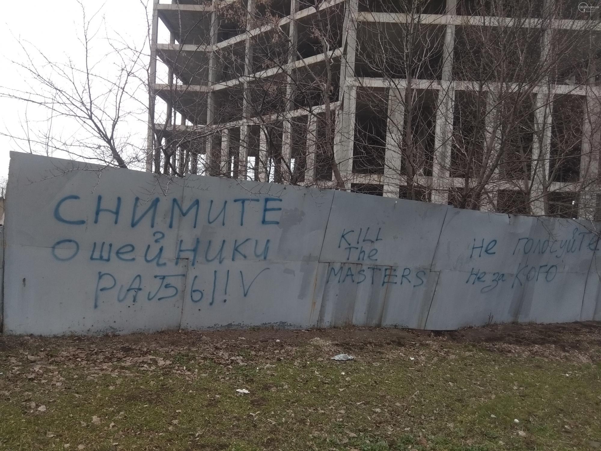 А огромная надпись "Снимите ошейники, рабы" и "Не голосуй ни за кого" появилась в Приморском районе.