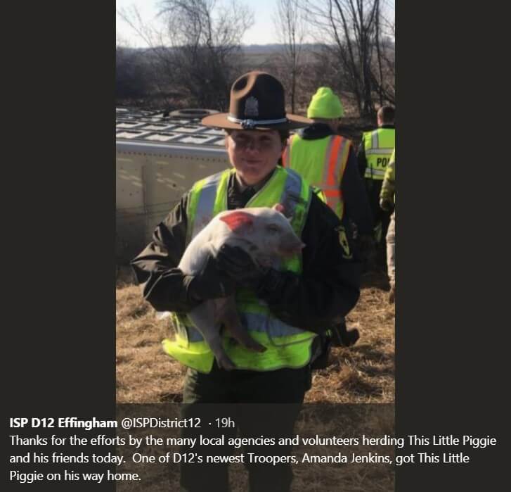 Позже власти поблагодарили два местных полицейских управления, пожарную службу, министерство транспорта и другие агентства за их совместную работу по отлову и транспортировке поросят. Департамент также опубликовал фото женщины-офицера, несущей маленького поросенка на руках.